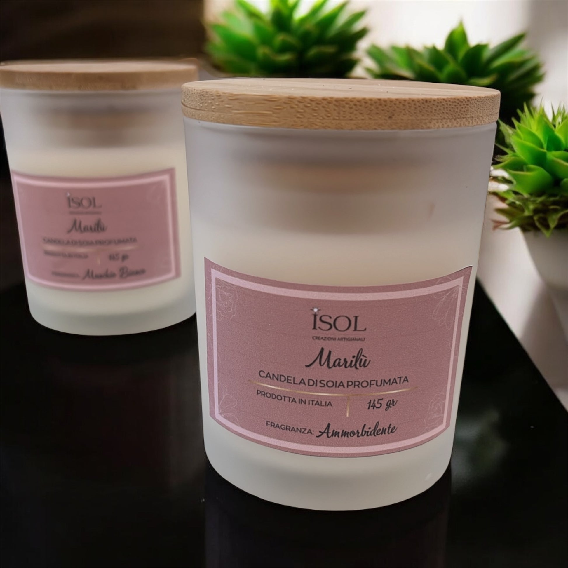 Candela vegetale in cera di soia in contenitore di vetro opaco semi trasparente e coperchio in bamboo.